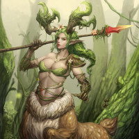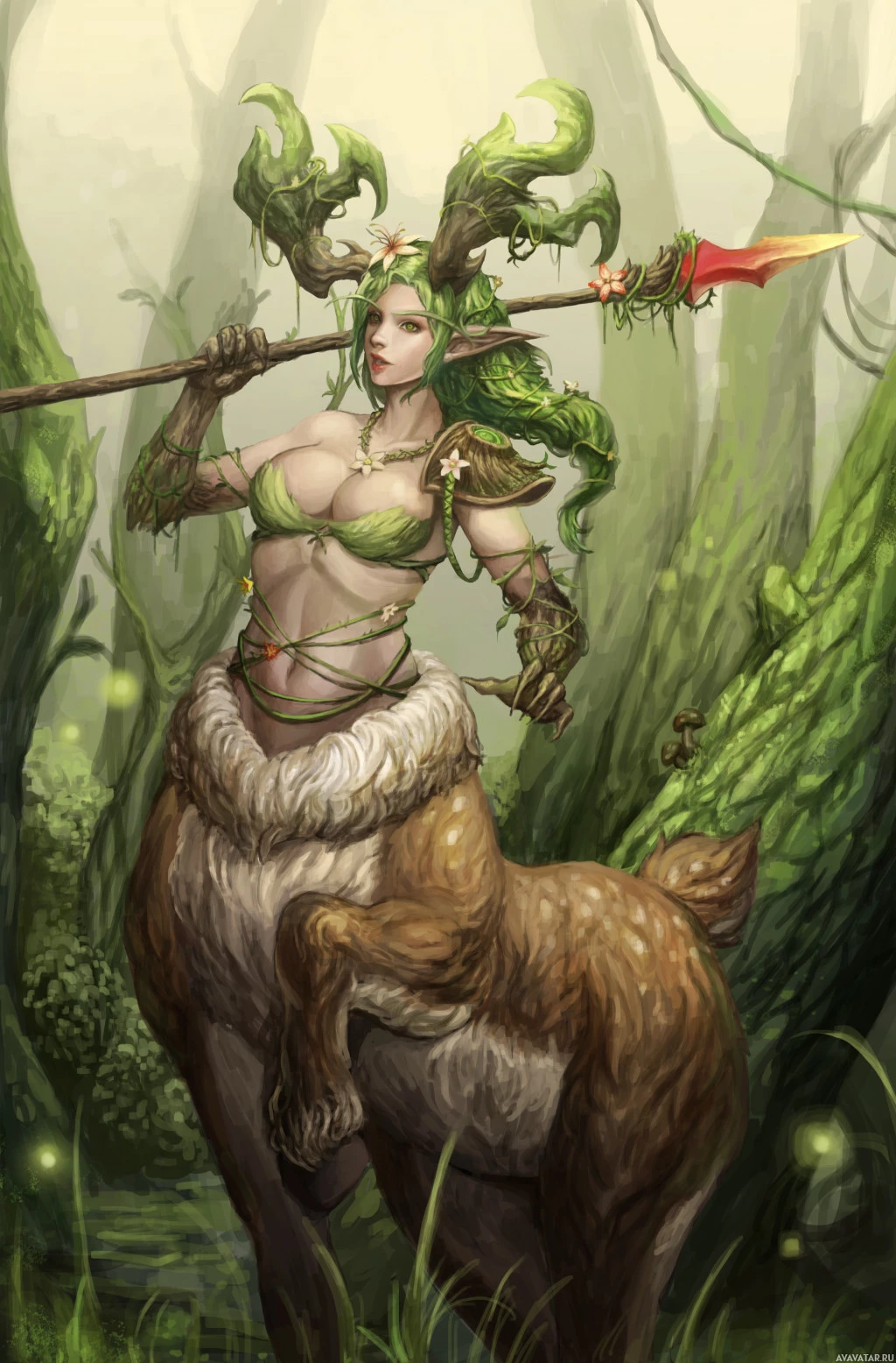 pointed ears and a flowing, green mane that resembles a tree. She is holding a lance with both hands, and there's a bow on her back, suggesting she might also use ranged weapons. The character is wearing armor that seems to be made of