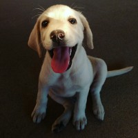 Labrador puppy sitting on the floor. The dog appears happy, as evidenced by its