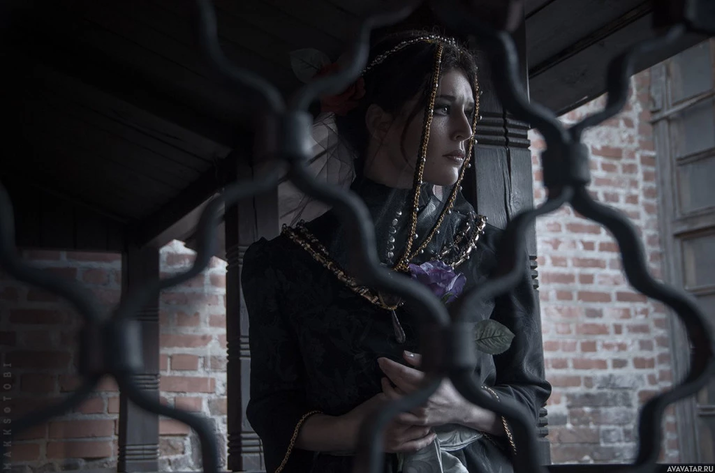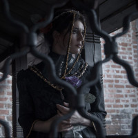 dark clothing with ornate detailing, including what appears to be a pearl or gem at their throat. The setting is outdoors, with the character looking through bars or gates, which gives it a somewhat dramatic and moody atmosphere.