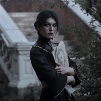 a black jacket with elaborate detailing and a distinctive necklace. Her hair is styled into an updo, adding to the overall dramatic appearance of her outfit. She has