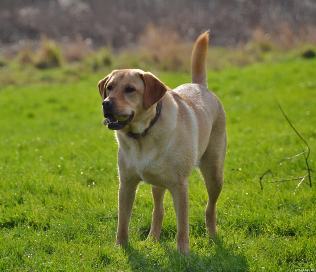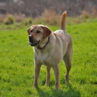 The image shows a dog, specifically a Labrador Retriever, standing in an open