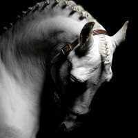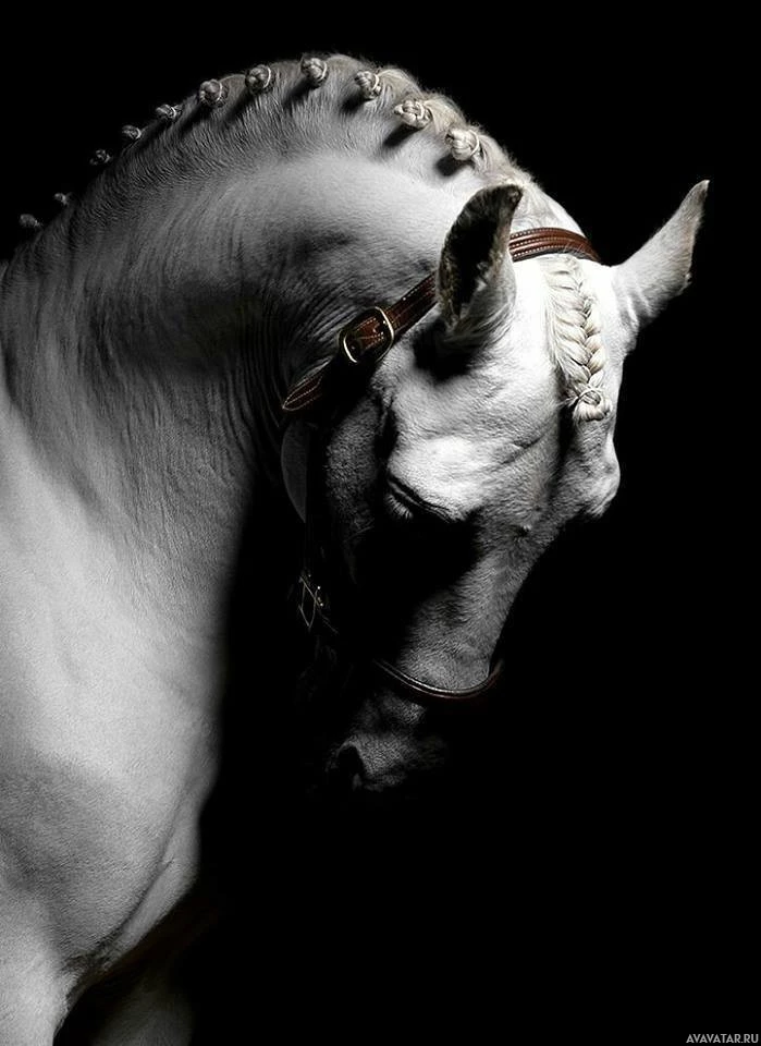a white horse with a braided mane, which is a traditional style for dressage horses. The horse appears to be looking down and is wearing a bridle, indicating that it might be well-trained for