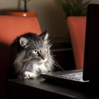 a focused expression and is looking intently towards something off-camera, possibly the camera or another person. This scene is humorous because it seems as if the cat is engaging with the computer in a human-like manner, but without any actual understanding of what's happening on the screen.