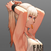 sports top and appears to be looking downward, possibly at something she's holding or wearing. Her expression seems focused or intent on whatever she's doing. The overall style of the image suggests it could be from an animation series or