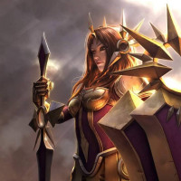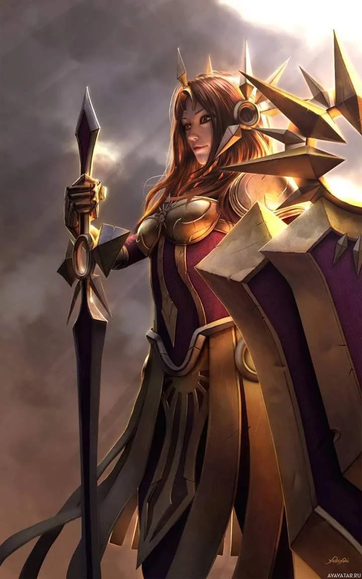 intricate designs, including what appears to be spikes on her shoulder pieces. She also wears a helmet that covers part of her face. Her attire suggests she may have a role related to combat or leadership within the context of her storyline.
