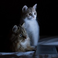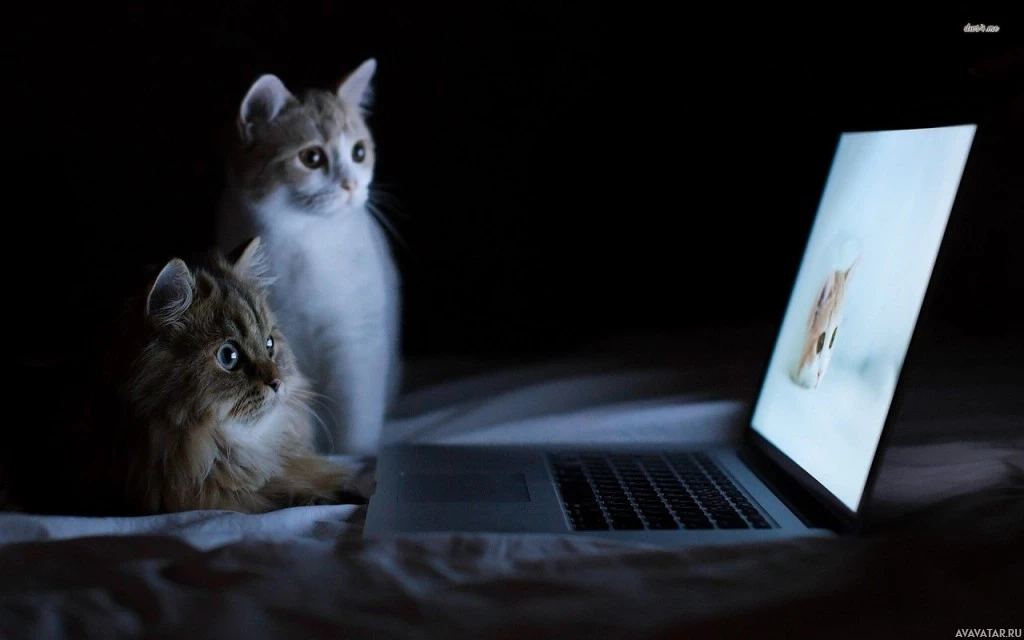 The image shows two kittens sitting on a bed and looking at the screen of