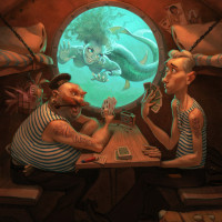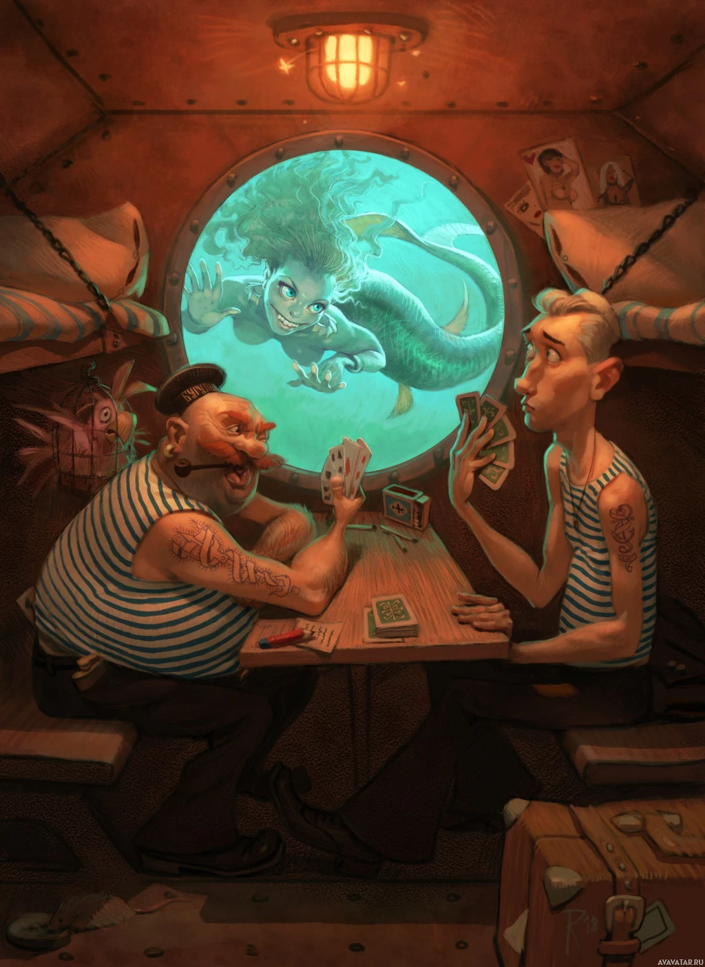 a deck of cards, seemingly engrossed in a game while the other listens attentively. Outside the porthole, there's an animated depiction of a mermaid swimming by, adding