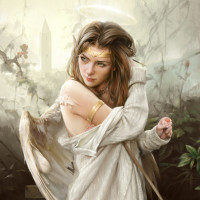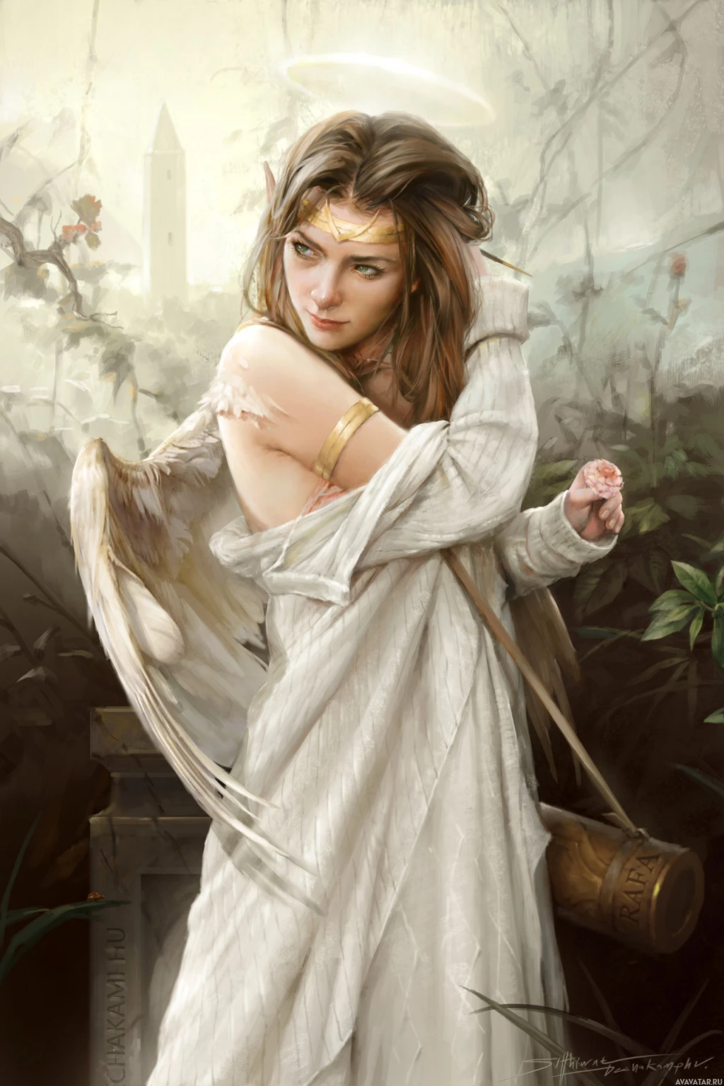 a fantasy setting. The angel has wings and is holding a staff or a scepter, which are often associated with such characters in