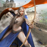 an elf character. She is holding a bow and appears to be aiming it at something or someone in the distance. Her attire, including her armor and clothing, suggests she may be part of a warrior or archer class within this