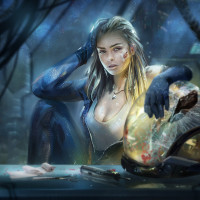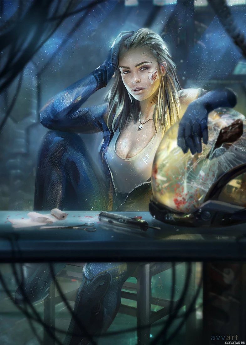 blonde hair and is wearing what seems to be a spacesuit or a futuristic outfit with glowing blue elements, suggesting she might be in a space-related environment or scenario. The character is sitting at a table that has various items on it which could be related to her work or task. She also seems to have a book open in front of her, possibly reading or studying. The overall ambiance of the image gives off a dark and moody vibe, with a focus on