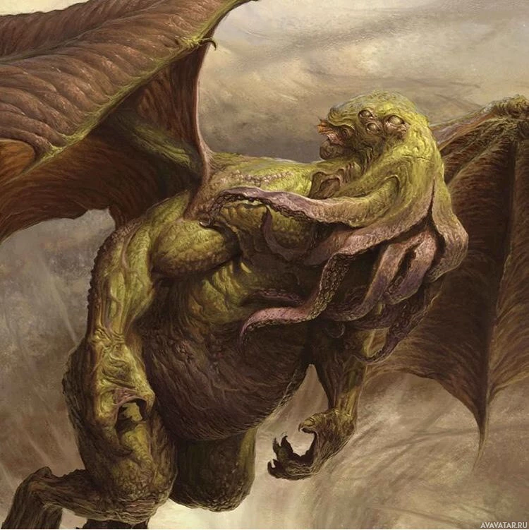 a fantasy creature that appears to be a blend of Cthulhu and an octopus. It has the distinctive tentacular body and face of an octopus but is also adorned with wings, resembling