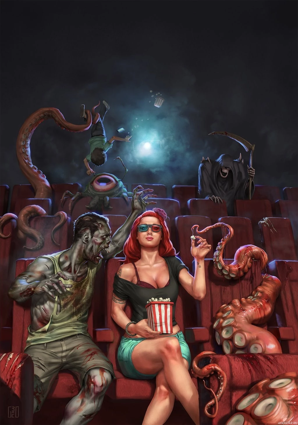 the front row of what appears to be a cinema, accompanied by various undead or zombie creatures. These creatures are standing behind her and on either side of her, looking at her with what could be interpreted as