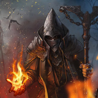 an intense pose, surrounded by flames. The figure is wearing dark, somewhat medieval or fantasy armor and is holding what appears to be a staff with