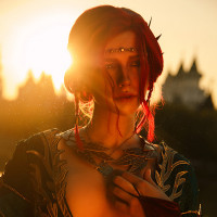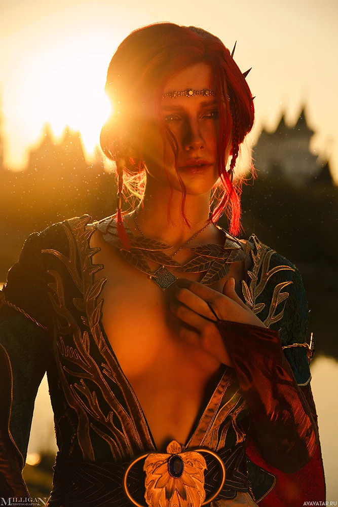 golden light suggesting either sunrise or sunset. The cosplayer is captured in a pose that accentuates their costume and character.