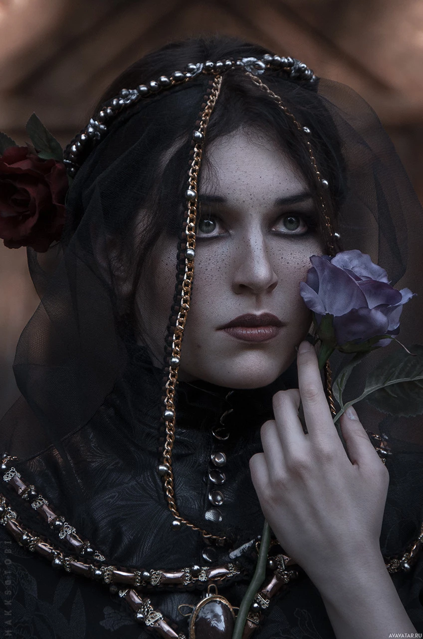 a black dress adorned with roses and a veil, holding a purple flower in their hand. Their makeup is dramatic, enhancing the character's mystical and otherworldly appearance. The setting appears to be dimly lit, with