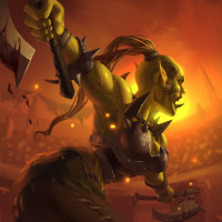 battle scene with flames and smoke, implying that the orc is engaging in combat.