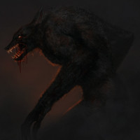 horror scene featuring a werewolf. It appears to be an illustration with dark, somber colors and a sense of menace or threat conveyed by the character's expression and posture. The werewolf is shown in profile, facing towards the right side of the frame, which adds to