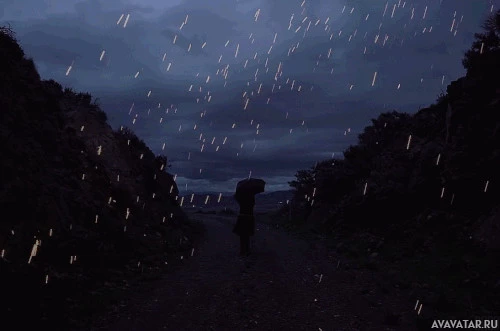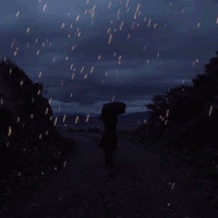 The image shows a person walking with an umbrella during the night. There is rain or