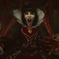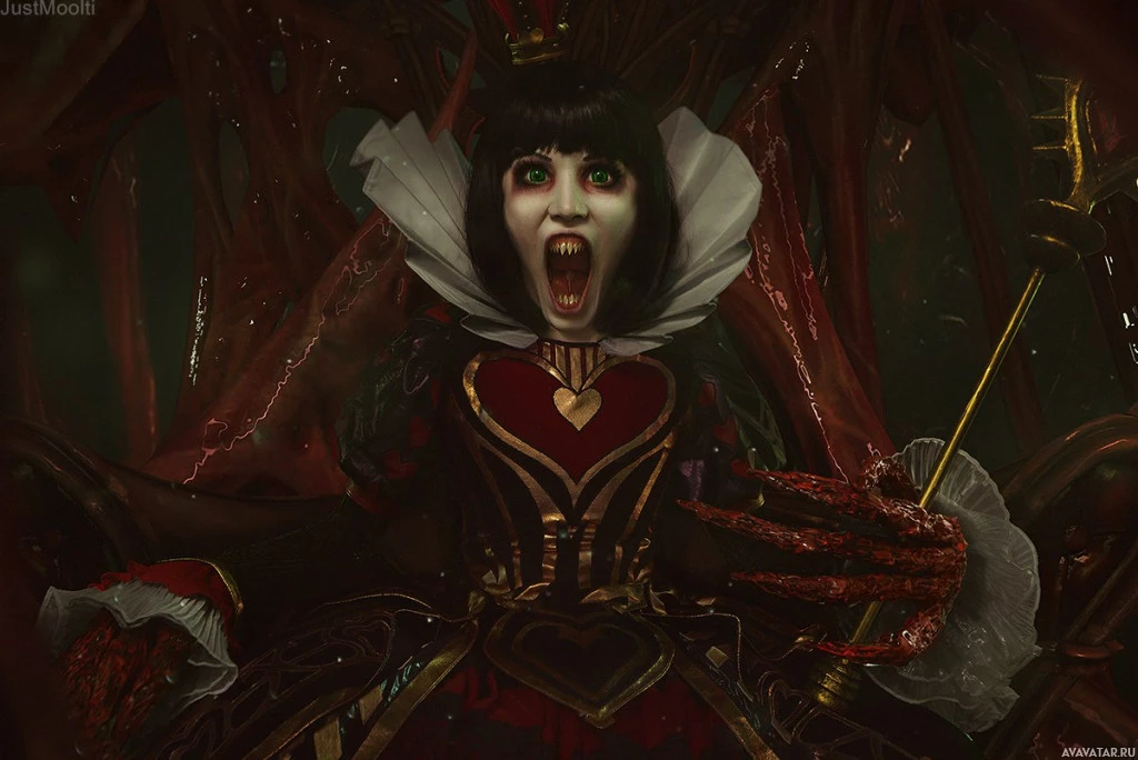 dark hair, and is wearing what looks like a corset and dress with a vampire-like design. They are holding a dagger in one hand and have a distressed or aggressive expression on their face. Surrounding the character are ominous red tendrils that resemble veins or roots, giving the impression of a dark,