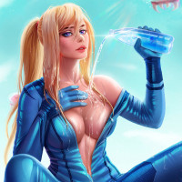 a female character, who appears to be from the Metroid series. She is depicted in her