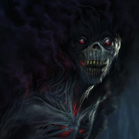 The image depicts a horror-themed artwork. It shows a creature that appears to be a humanoid with pale, sickly skin and glowing