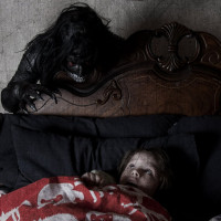 The image depicts a scene with horror elements. There is a child lying in bed, looking scared or frightened, while a creature resembling a monster or demon appears to be looming over the bed, which creates an atmosphere of horror and fear.
