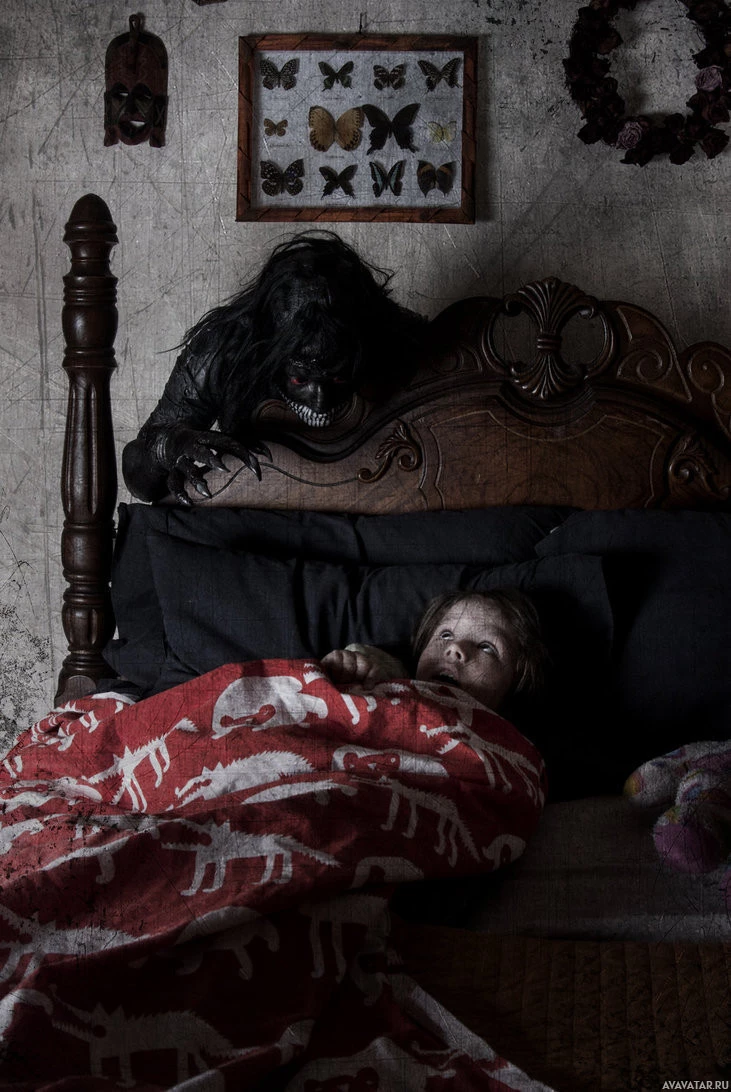 На картинке изображена сцена с элементами ужасов. В постели лежит ребенок, который выглядит испуганным или испуганным, а над кроватью нависает существо, похожее на монстра или демона, что создает атмосферу ужаса и страха.