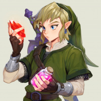 iconic sword on his back and has a protective gauntlet on his left arm. The background is plain, allowing the focus to remain on Link and the items he's holding.