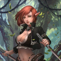 a warrior type or involved in combat situations. The setting includes a forest-like environment with trees and a canopy overhead, indicating