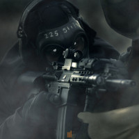 a training exercise or a real-life scenario with smoke or fog in the background, which gives an impression of a serious or intense atmosphere. The