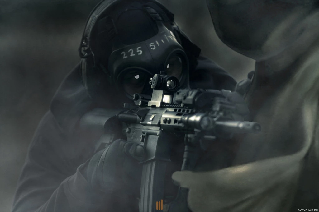 The image shows a scene with two individuals, one of whom appears to be a soldier equipped with