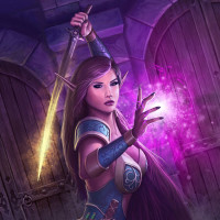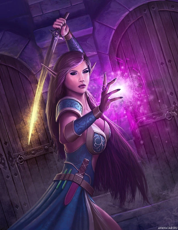 a fantasy scene with an elf character. She is holding a sword in her right hand and appears to be casting a purple