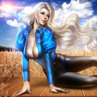 white hair and is wearing a blue jacket over a black outfit. She is seated on the ground, looking at the viewer with