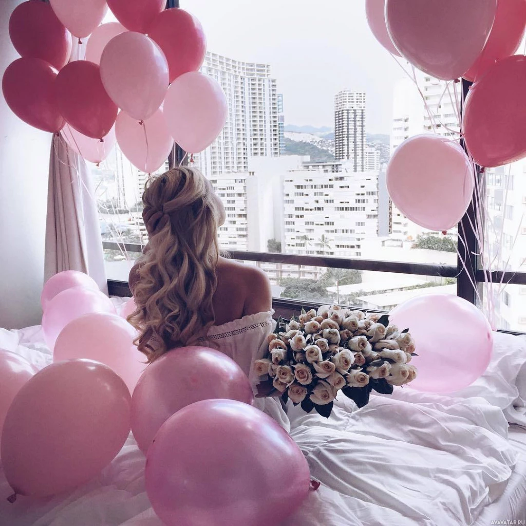 the city skyline through a window. She is surrounded by an abundance of pink balloons that are floating around her, creating