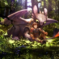 brown hair, wearing a green tunic and leggings, accompanied by a sword sheath on her belt, suggesting she is prepared for combat or adventure. Next to her is a dragon that has the appearance of Toothless from an animated