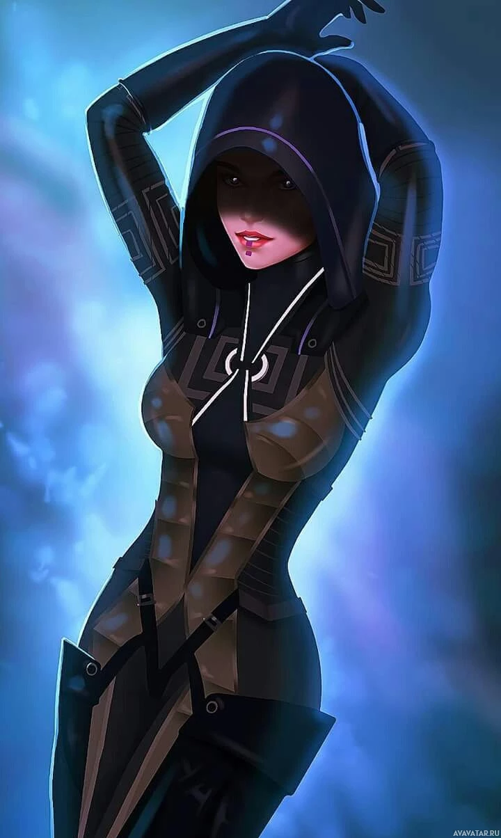 На картинке изображен персонаж из видеоигры «Mass Effect». Этот персонаж изображен в наряде с капюшоном с футуристическим дизайном, вероятно, представляющим доспехи или костюм, который может быть частью визуального стиля игры. Фон предполагает научную фантастику с мрачной и угрюмой атмосферой.