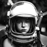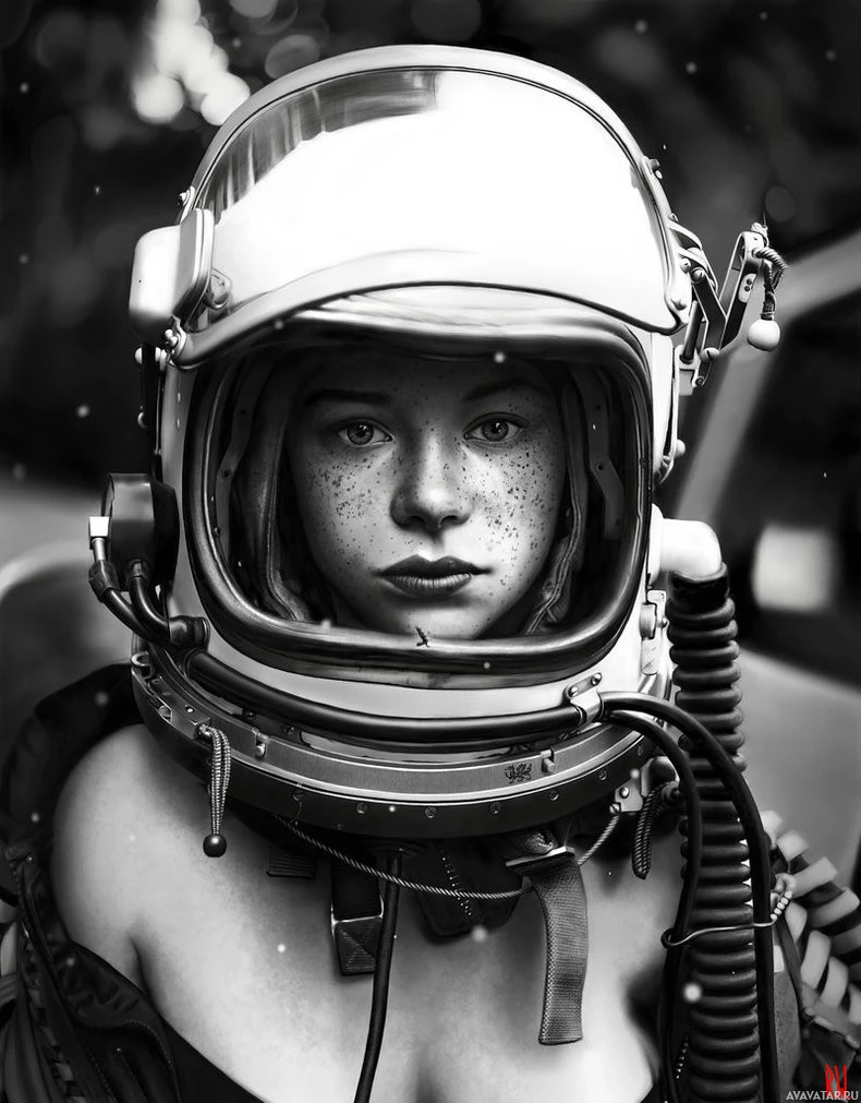 На снимке изображен человек, одетый в полный костюм космонавта, в том числе шлем со шлемом. Они смотрят прямо в камеру со спокойным выражением лица. Фон не в фокусе, но, похоже, на открытом воздухе с деревьями и естественным освещением, что может указывать на то, что это либо рассвет, либо сумерки из-за мягкого освещения.