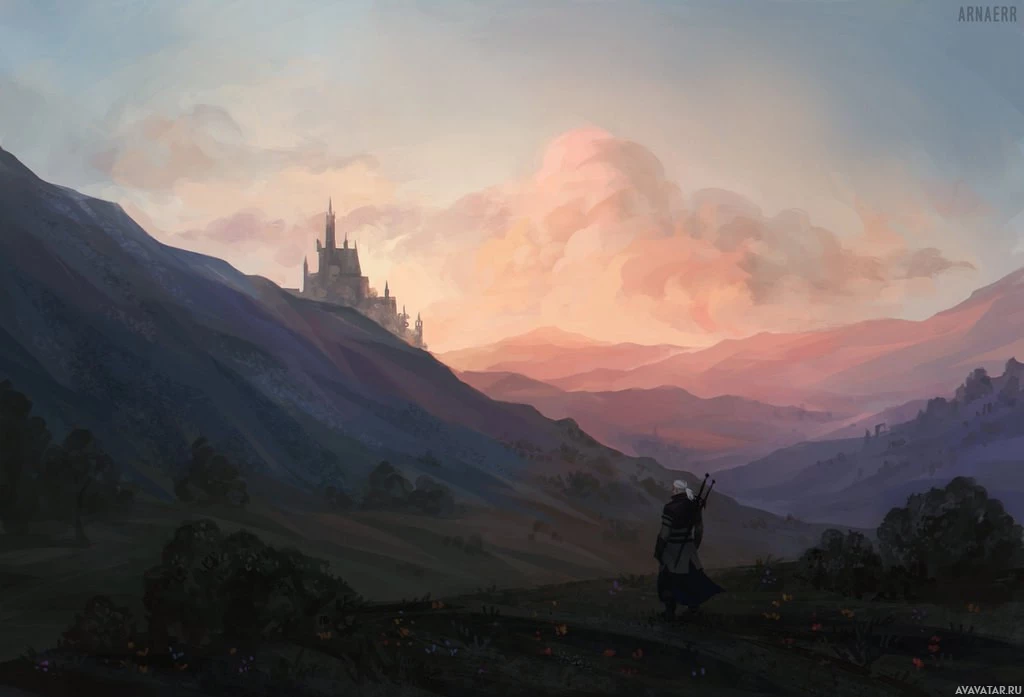 The image depicts a scenic landscape that appears to be from the game "The Witcher 3: