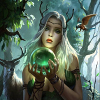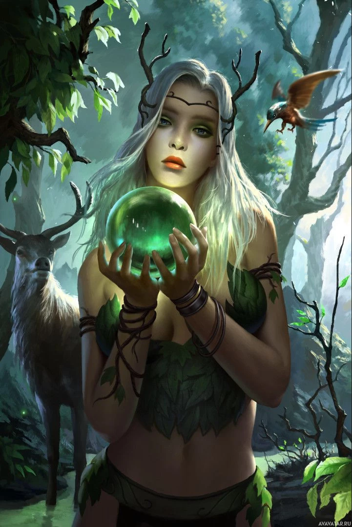 a green bodysuit, adorned with leaves that give the impression of foliage or a jungle-like environment. Her expression is serene and focused as she holds a glowing orb between her hands, which adds to