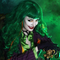 the Batman series. The individual is dressed in colorful clothing and makeup reminiscent of the Joker's iconic style, complete with a green wig and
