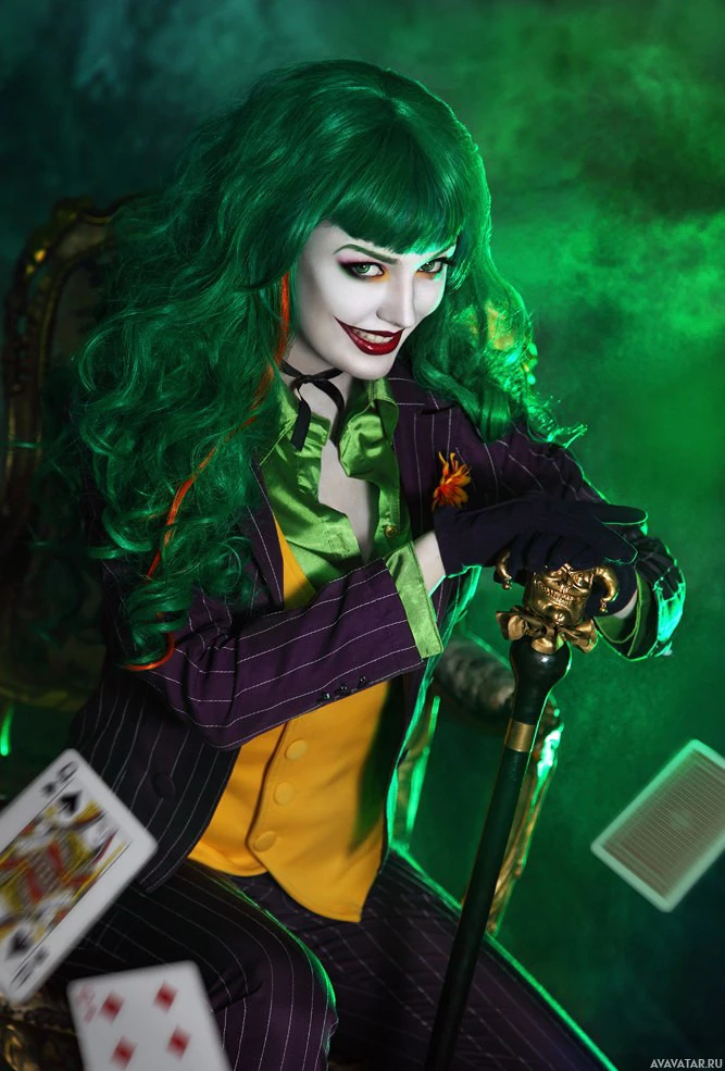 The image depicts a person cosplaying as the Joker, a character from