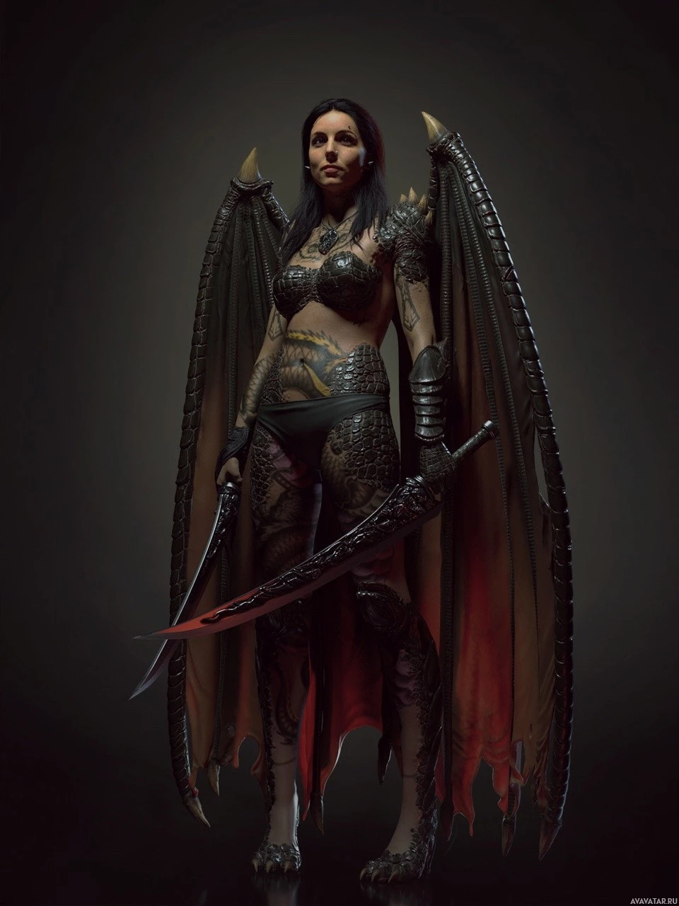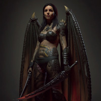 Это образ фантастического персонажа. Человек носит доспехи с демоническими или фантастическими элементами, такими как острые плечи и крылья, прикрепленные к спине. Они держат меч в одной руке и щит в другой. Персонаж имеет татуировки на руках и выглядит как женщина. Общая эстетика предполагает, что это может быть концепция для видеоигры или персонажа фильма.