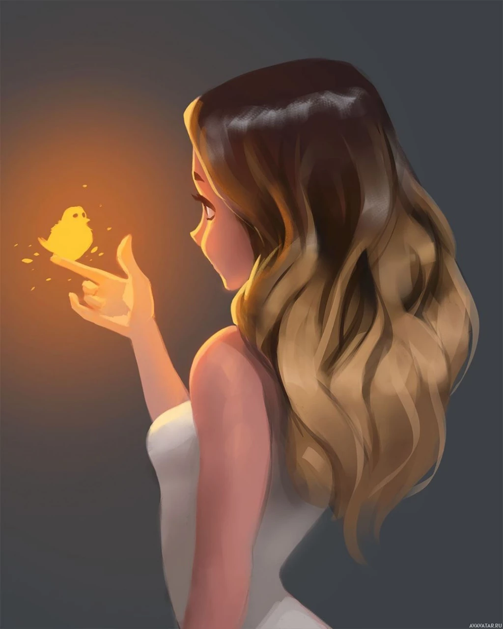 a female character who appears to be magically conjuring a bird from her hand. The character has long,