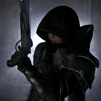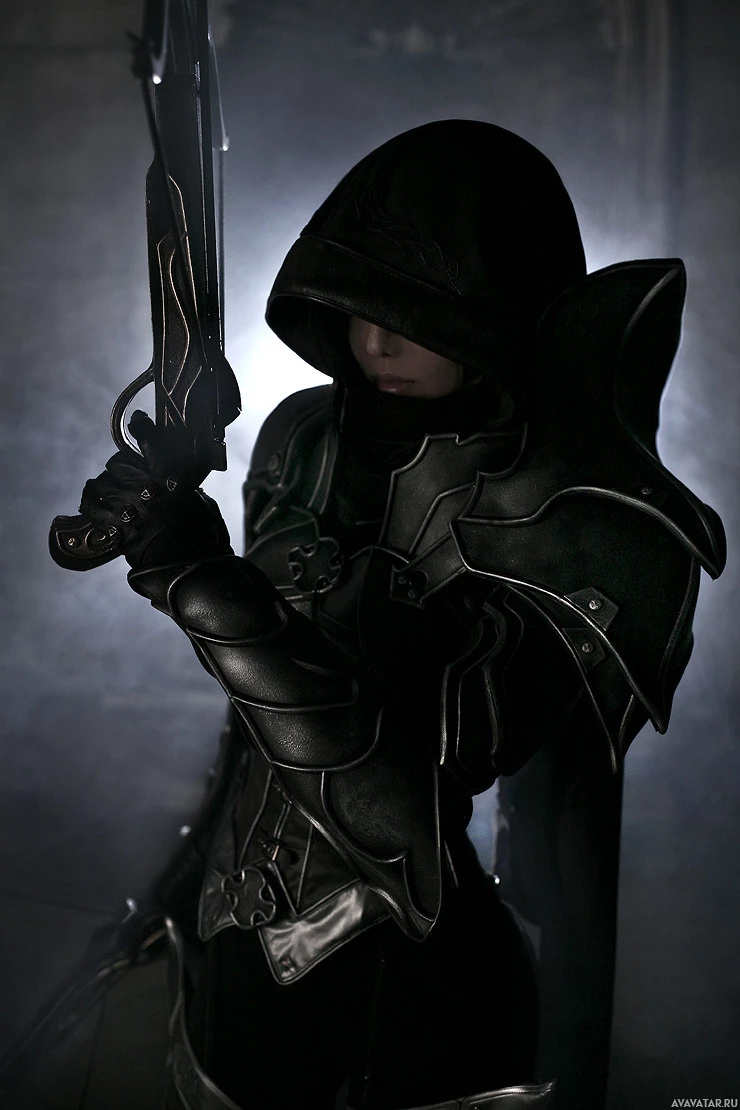 hooded cloak with a large green gem on the chest and wielding a staff in one hand and a sword with a decorative handle in the other. The person has their face obscured by the hood, giving them an anonymous appearance while emphasizing
