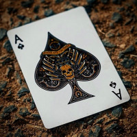 The image shows a playing card lying on its side. It is an Ace of Spades, which is a common symbol in tarot and other playing card decks. The design features the iconic spade emblem with a skull at the center, representing death or danger. This card is often associated with risk-taking or high stakes due to its name as "spades" and the skull motif.