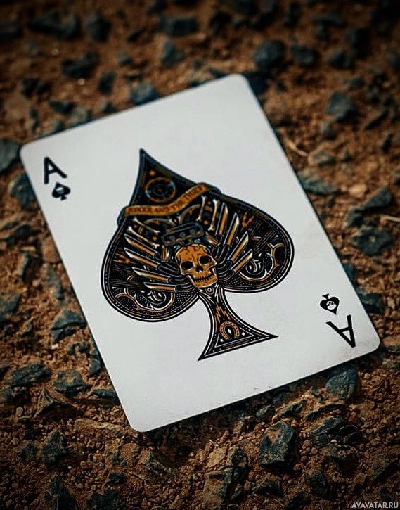 На картинке изображена игральная карта, лежащая на боку. Это Ace of Spades, который является общим символом в Таро и других колодах игральных карт. В дизайне есть знаковая эмблема лопаты с черепом в центре, представляющая смерть или опасность. Эта карта часто ассоциируется с принятием риска или высокими ставками из-за ее названия как «спады» и мотива черепа.