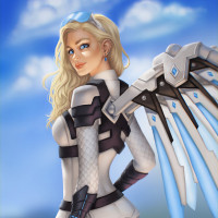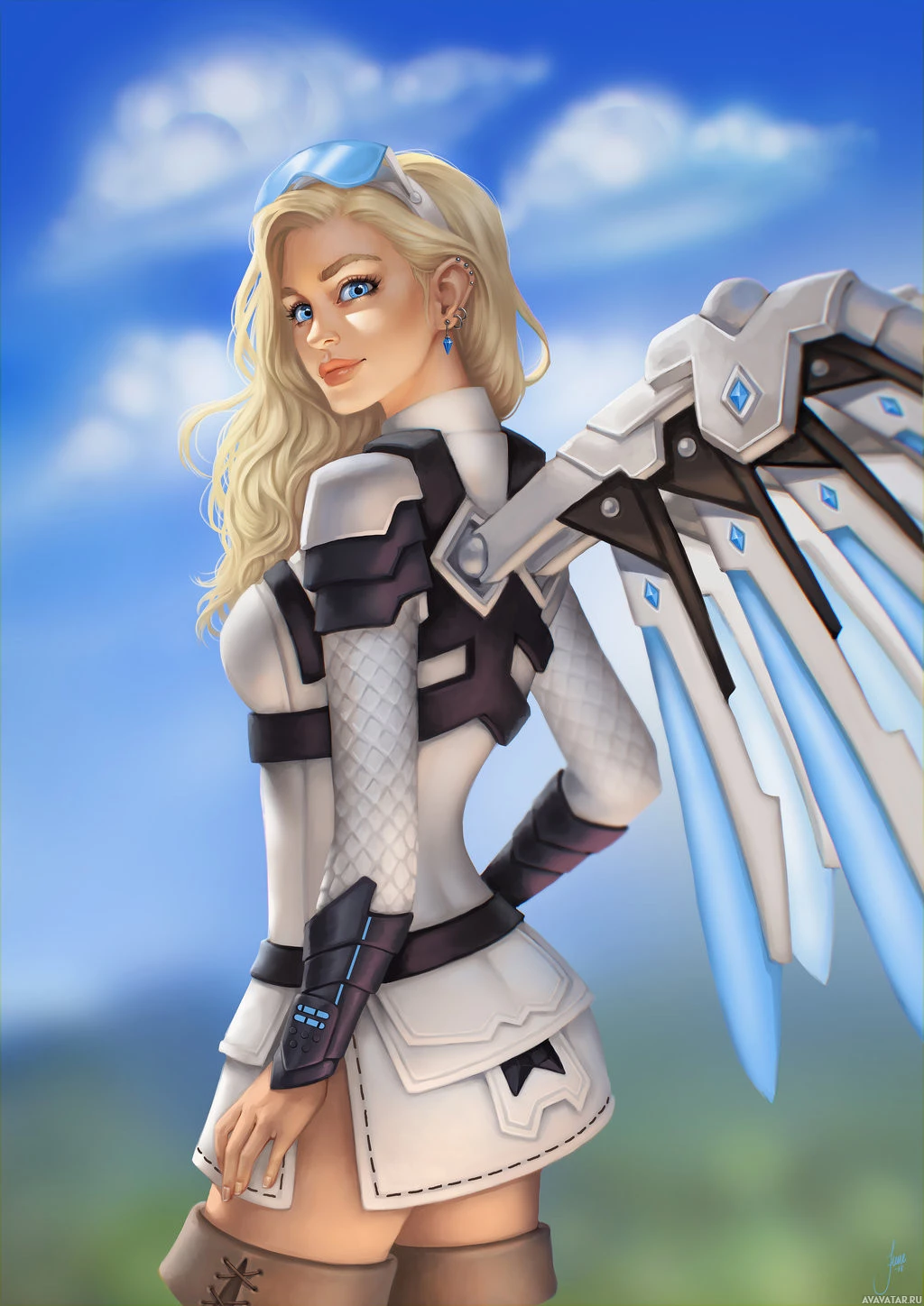 The image shows a 3D animated character, likely from the video game "Overwatch." This character is Mercy, known for her healing abilities and her angelic wings. She is portrayed in a stylized, artistic manner that showcases her as a valiant hero.