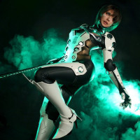 The image shows a person dressed in futuristic, possibly