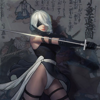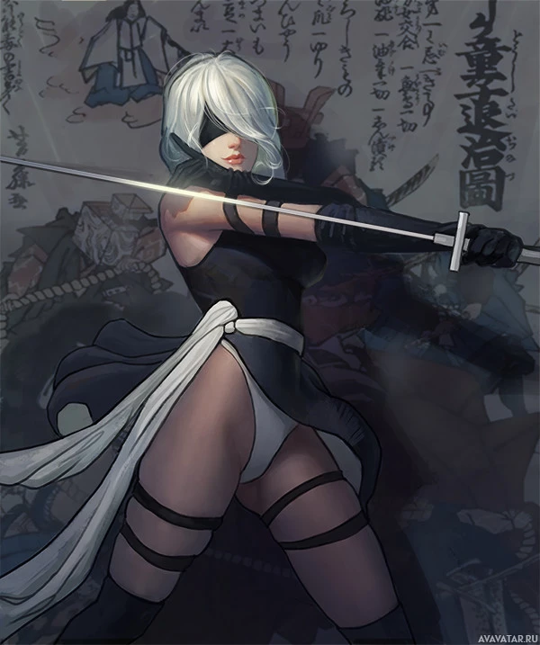 a dynamic pose, holding a sword with both hands and aiming it towards something not visible in the frame. The character's attire and stance suggest she may be part of a group or organization associated with warriors or soldiers, possibly within the context of the game's narrative. The background is somewhat blurred but includes what appears to be Japanese characters, which might indicate a setting related to Japanese culture or history within the game.