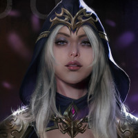 На картинке изображена женщина, которая носит то, что кажется фэнтези или средневековой броней. У нее длинные светлые волосы и она смотрит прямо на зрителя с серьезным выражением лица. Ее одежда включает в себя золотые и фиолетовые элементы, и она носит капюшон, который покрывает ее голову. Стиль изображения предполагает, что это может быть игра, комикс или анимационный сериал.